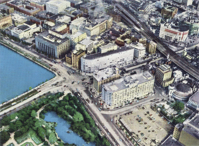 Aerial view of the Yurakucho district, c. 1960. The Nikkatsu Hotel is seen at center. Upper-left of center is the Dai-ichi Seimei Sogo building; at upper-right of center is the Nichigeki Theater.