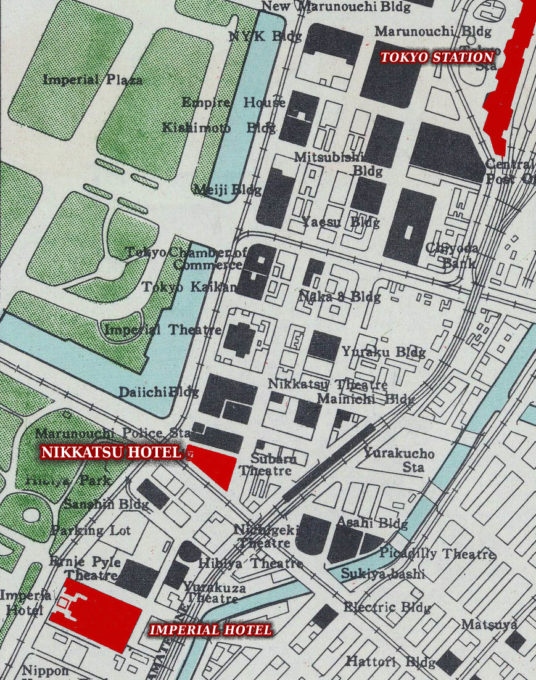Map: Location of the Nikkatsu Hotel, Tokyo, c. 1952. relative to the Imperial Hotel and Tokyo Central Station.