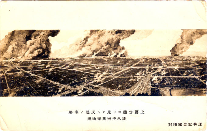 Aerial panoramic view of Tokyo in flames, 1923, looking south from above Ueno Park. Shinobazu Pond and Ueno Hirokoji are seen at lower-right.