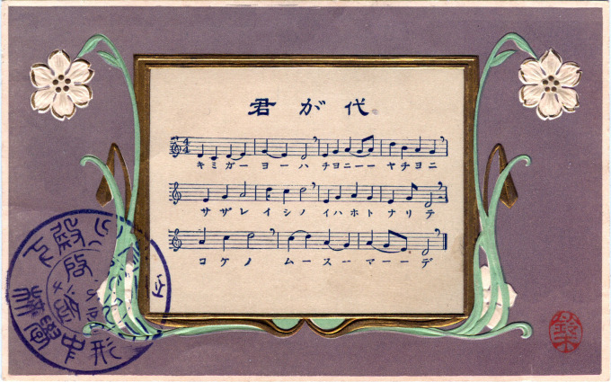 “Kimigayo” commemorative postcard, c. 1910, with music and lyrics. The first “Kimigayo”, composed by a visiting Western military band leader, was discarded as “lacking solemnity”. An original melody was instead composed in 1880, based on traditional Japanese court music and arranged with Western-style harmony by the German musician and composer Franz Eckert who was, at the time, an “oyatoi gaikokujin” [“hired foreigner”] of the Japanese government. This was the version adopted as Japan’s national anthem in 1888.