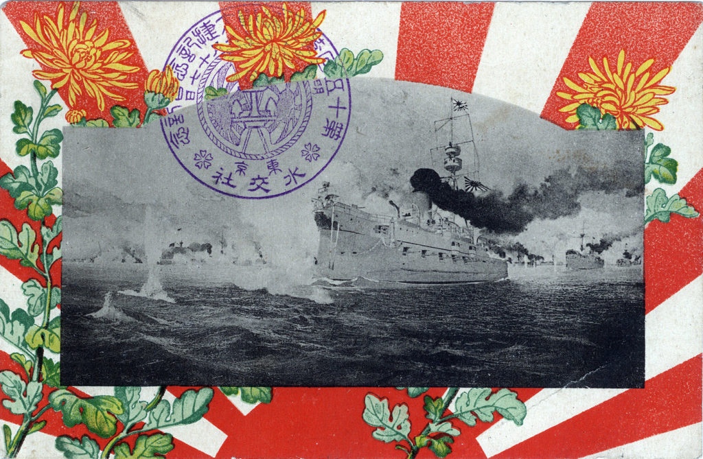 Battle of the Yalu River (1894) during the First Sino-Japanese War (1894-1895), published as a propaganda postcard for the sea battle’s 10th anniversary during the Russo-Japanese War (1904-1905), c. 1905. The battle on Sept. 17, 1894 between twelve Chinese ironclads and eleven modern Japanese warships, including the cruiser Matsushima above, ended with a Japanese victory. Without the loss of a single ship the Japanese navy destroyed seven of the Chinese fleet and forced the others to seek refuge at Port Arthur. The sea battle afforded the world its first real view of modern steel men-of-war in action under fire, and offered naval and military experts their first opportunity to gauge the aptitude of the Japanese in their adopting of modern weapons and methods of warfare.