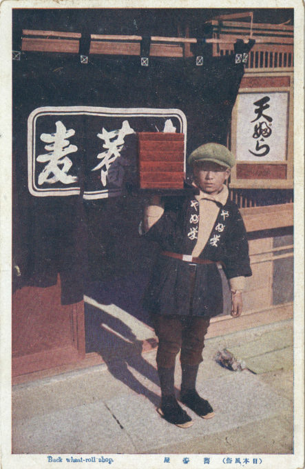 “Buck wheat-roll (soba noodles) house” deliveryman, c. 1920, standing in front of the shop’s noren. Signage on the right indicates “tempura” is also served there, so it is a good guess that the soba shop also makes tenzaru soba, a summertime cold noodle dish (zaru soba) with tempura served on the side.