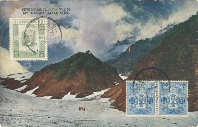 “A view of snow valley of Mt. Hakuba, a famous mountain of Japan,” postcard reverse, 1928. Credit is often given to William Gowland (1842-1922) for the creation of the term “Japan Alps”. A Meiji-era mining engineer, who came to Osaka from England to work at the Imperial Mint, Gowland roamed through the Japanese back-country in the late 1870s mainly to survey the country’s mineral resources. In one account, published in 1881, he described the pinnacled ridges of central Honshu as something “that might perhaps be termed the Japanese Alps.”