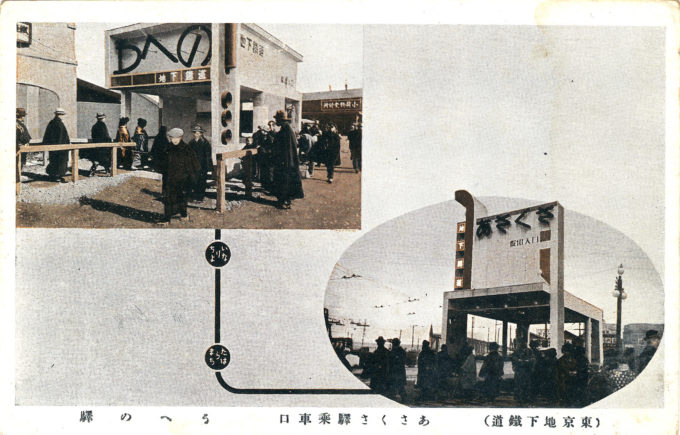 Terminal entrances at Ueno (upper left) and Asakusa (lower right) on the opening day of the Tokyo Underground Railway Co., Tokyo, December 30, 1927, with Inaricho and Tawaramachi stations labeled between them.