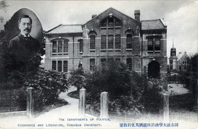 “The Departments of Politics, Economics and Literature”, Doshisha University, c. 1920. The inset photo is of the university’s founder, Joseph Neesima (born Niijima Shimeta), who secretly left Japan in 1864 for the United States in violation of the Tokugawa sakoku edict that had effectively isolated Japan from the rest of world for 214 years. After the Restoration, when the Iwakura Mission visited the United States in 1871 on its around-the-world expedition, Neesima assisted as an interpreter, traveling with the Mission for more than a year, in Europe and the United States, befriended by two important bureaucrats who would prove vital to the establishment of his Doshisha English School in 1875 which, by 1920, had been granted university status by the government. Niijima’s wife, Yamamoto Yaeko, would later found Doshisha Girls’ School (now Doshisha Women’s College of Liberal Arts) in 1876. In 2013, Doshisha University was ranked fourth among Japanese private universities for “schools to which parents wish to send their child.”