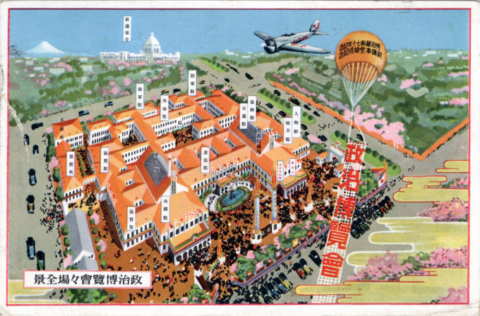 Exposition advertising postcard commemorating the 70th anniversary of the “Meiji Assembly”, Ueno Park, Tokyo, 1938. The exposition celebrated not only the Meiji Restoration and the Charter Oath of 1868 (which outlined the main aims and the course of action to be followed toward national modernization) but also the recent completion of the nation’s new parliamentary assembly building, the Imperial Diet. Among the exposition’s sponsors was the Mainichi Shimbun, the country’s largest newspaper, whose courier airplane (J-BANC, a Breda Ba.33) is seen overflying the fairgrounds at Ueno Park with the new Diet Building and Mount Fuji visible in the distance.