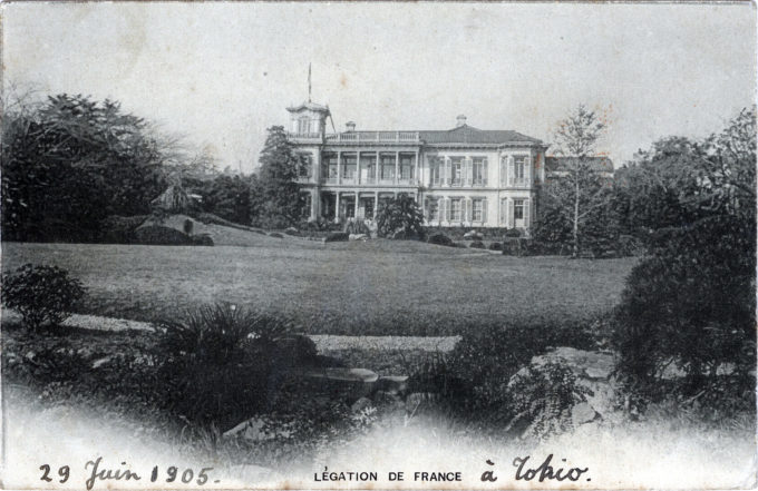 French Legation, Tokyo, 1905. The first French legation was established in 1858 (and would be raised to ’embassy’ status in 1906) and later took residence at Iidabashi near the Imperial Palace. The building was severely damaged by the Great Kanto Earthquake in 1923, and replaced in 1928 by a new building designed by Antonin Raymond. To the Japanese people of the Meiji Era, French political thought was key to forming the ideal state of politics. In the process of building Japan’s modern legal system, French laws, including the Code Napoléon, served as important models for the emerging Japanese government bureaucracy.