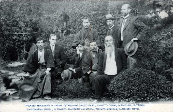“Friends’ ministers in Japan”, c. 1920. Standing: Chuzo Kaifu, Shigeto Ouchi, G. Binford. Sitting: Chiyomatsu Suzuki, G. Bowles, Mansaku Nakamura, Tokuzo Mishima, Kazuharu Kato.