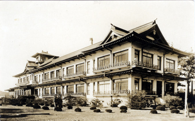 “… [T]his distinguished and pretty hotel stood three floors high and was roofed with sparkling green tiles. Their front-facing rooms overlooked the calm Mikawa Bay with superb views of Takeshima Island, the Yaotomi Shrine and other small islands. Members of the Japanese royal family were among the guests who had stayed over the years. Rooms cost ¥900-¥7,000 without a meal, and the hotel boasted a golf course and a table tennis room.