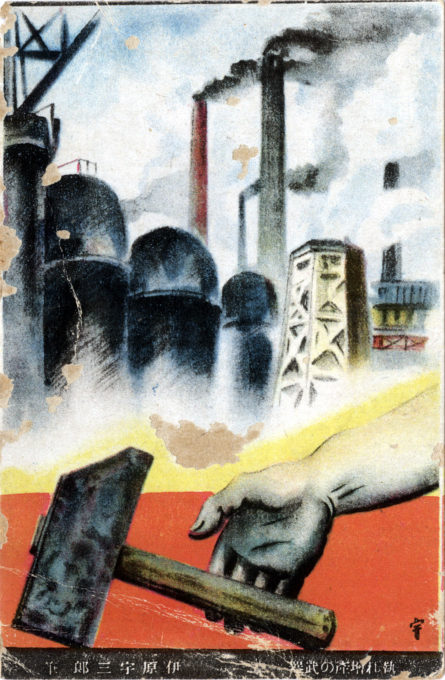 “Grab the weapon for production increase”, propaganda postcard, c. 1940. Commercial art by Usabura Ihara. Published by the “Supporting Society of Kokumin Choyo (Citizen Mobilization, Requisition)”.