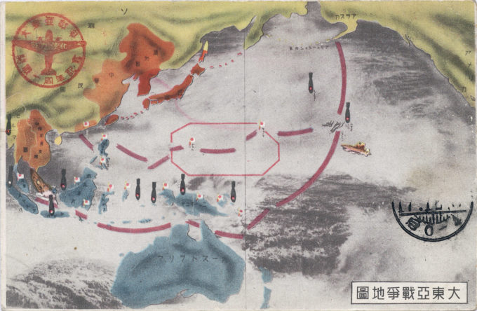 “Greater East Asia Co-Prosperity Sphere” [Dai Tōa Kyōeiken] propaganda postcard, 1942, mapping the member territories and early Pacific War attacks and territorial gains against the ABCD powers (American, British, Chinese, and Dutch) in the early months of the war. The co-prosperity sphere was a pan-Asian concept created and promulgated by the Empire of Japan from 1930 to 1945 for occupied Asian populations. It promoted the cultural and economic unity of East Asians, Southeast Asians, South Asians and Oceanians against Western imperialism but which was, itself, an example of Japanese imperialism.
