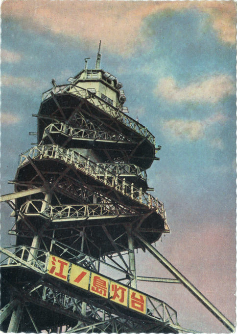 Heiwa Lighthouse, Enoshima, c. 1960. Heiwa Lighthouse was replaced in 2003 by the Enoshima Sea Candle. Back-caption: “The tower was 43 meters high and stairs reached a glass-walled observation tower which provided a spectacular view of the entire Shonan area and the Izu area. The lighthouse on top had an 800,000-candle power spotlight.”