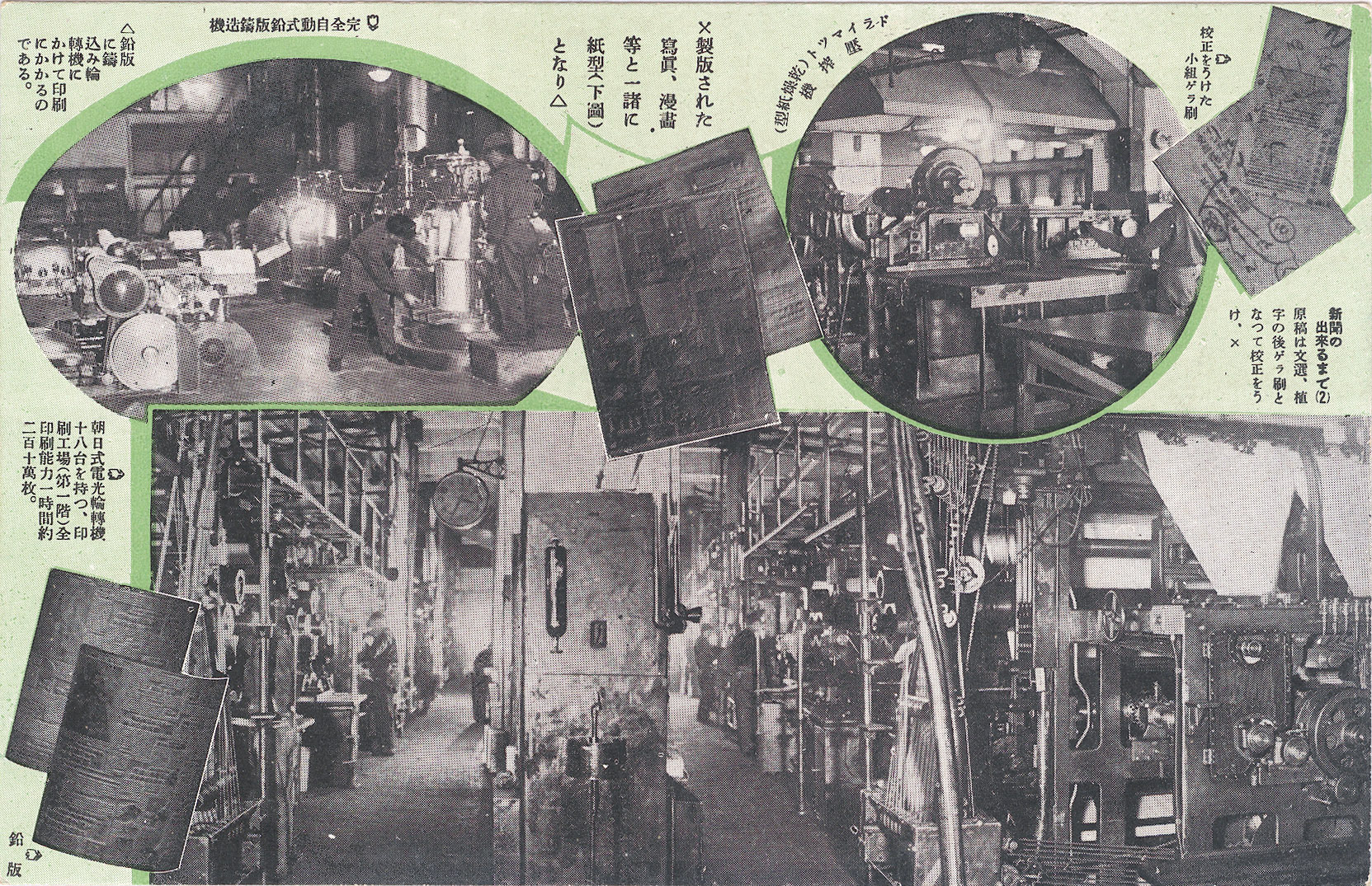 - “How Newspapers Come to Be”, Asahi Shimbun operations postcard series, c. 1935. “Manuscripts are typeset, printed, and proofread by the proofreading department. Lead plates are made and affixed to the printing press. Each of Asahi’s 18 rotary presses have a capacity of 1,930,000 impressions per hour.”