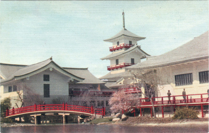Japan Pavilion, Golden Gate International Exposition, San Francisco, CA, 1939. Back-caption: “Japan, symbolized in this replica of a feudal castle and samurai house, depicts its rich culture in a harmonious blend with its modern industrial arts and exhibits. Amid a garden of serenic beauty visitors enjoy a bit of Japan transplanted in America.”