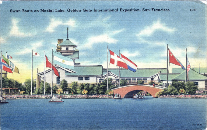 “Swan Boats on Medial Lake”, Japan Pavilion in profile, Golden Gate International Exposition, San Francisco, 1939.