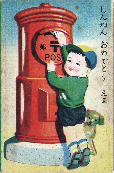 “Japan Post” New Year’s promotional postcard (“Nengajou”), c. 1930. When the Meiji government established Japan’s postal system in 1871, New Year’s greetings were still sealed in envelopes. But with the creation of the postcard medium, citizens quickly switched to sending New Year greetings via postcard from as early as 1875. In 1907, new legislation allowed postcards to be dropped in mail collection boxes as long as they were marked “New Year’s greetings” on the front.