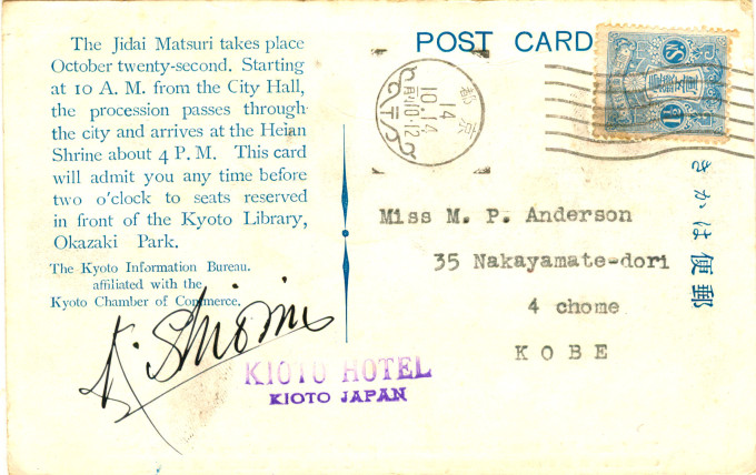 Reverse of the above postcard, postmarked 14 Oct 1914, showing a personal invitation to the Jidai Matsuri issued to a guest of the Kioto [sic] Hotel.