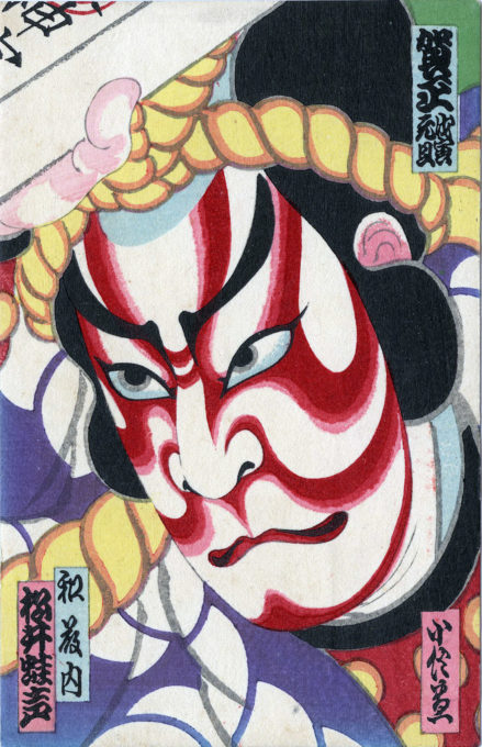 Kabuki stage makeup (kumadori), c. 1930. A postcard reproduction of a kabuki performance poster. Sujiguma is one variety of almost a dozen kabuki makeup techniques (suji, face; guma/kuma, shading), this one used for roles featuring heroes of super-human strength, filled with intense anger. Red kuma are drawn sweeping upwards over the lines of the face. A triangle in red is added on the chin; black ink is drawn on the corners of the mouth.