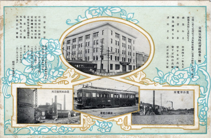 Keijyo (Seoul) Electric Power Co., advertising postcard, c. 1920, originally built with American capital but later purchased by Japanese industrial concerns. Photo insets show company branch office in Keijyo (Seoul), electric streetcar, gasoline refinery, and electric power generating station.