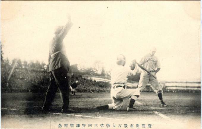 Keio University vs. University of Chicago, at Tokyo, 1915. In the third of three contests together, the Maroon of Chicago defeated the Blue and Red of Keio 3-0, sweeping the series. Chicago also played series with baseball clubs from Waseda and Meiji universities during a month-long tour of Japan.