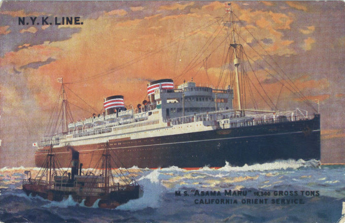 M.S. Asama Maru, NYK Lines, c. 1930, of the California-Orient Service. On its maiden voyage from Yokohama to San Francisco in in 1929, the Asama Maru set a new speed record for Japanese liners, making the crossing in 12 days vs. the 16-days it once took.