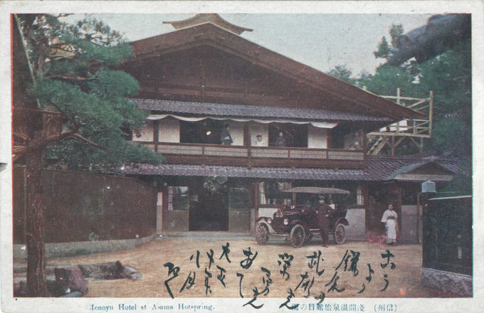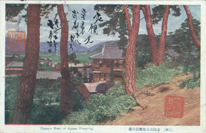 “Rather than stop at Matsumoto, those in search of pure air and the picturesque should repair to the spruce little vill. of Asama, 30 cho to the N.E., noted for its hot springs. Of the numerous inns, the best is the Me-no-yu.”