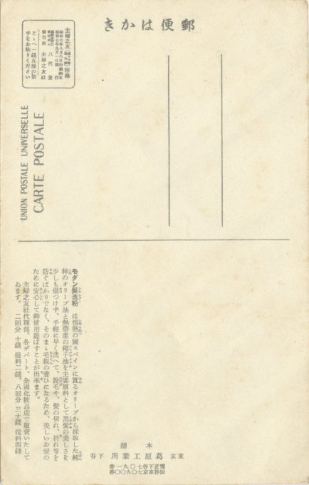 “Modern Shampoo” advertising postcard, c. 1935. “Wash your hair – and wash it with ease – no matter how much hair you have. [Endorsed by] the famous Tanaka Kinuyo of Shochiku [movie studio] and patron of Modern Hair Washing Cake Shop.” Also pictured in front of the “Modern Shampoo Bookstore”, located near present-day Shinagawa, Tokyo, are a 1930 Ford Model A 4-door sedan and an early-1930s Harley-Davidson motorcycle.