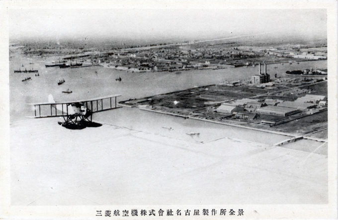 Nagoya Aircraft Works, Mitsubishi Aircraft Co., Nagoya, c. 1925, being overflown by a prototype twin-float 2MT4 (“Ohtori”) reconnaissance-scout biplane. Designed to be catapult-launched from a naval vessel (e.g. a battleship), the prototype was completed in March, 1925, but ultimately performed unsatisfactorily and was later scrapped. During the Pacific War, Mitsubishi’s Nagoya aircraft factories — responsible for producing the “Zero” and “Zeke” fighters, and “Betty” bombers — were the first sites targeted for bombing when B-29 raids on the city began in December, 1944.