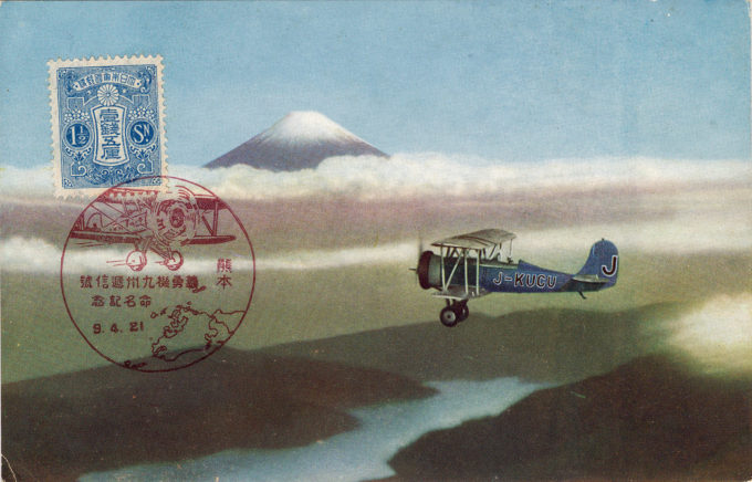 Nakajima P-1 type night-mail delivery plane, 1934, on a test flight past Mount Fuji. The airplane’s initial open cockpits were later enclosed to better protect the pilot flying at night through inclement weather conditions.