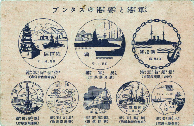 Imperial Japanese Navy bases, c. 1935. Souvenir tourist stamps from the IJN’s Naval Districts and Important Ports within the Empire. See map below. Top row (Naval Districts): Sasebo, Kure, Yokosuka; Bottom row (Important Ports): Ryoujyun (Port Arthur), Makou (Penghu, Pescadores, Taiwan Straits), Chinkai (Jinhae, Korea), Mahizuru/Maizuru (Kyoto), Ohaminato (Ominato, Northern Honshu). The status of Maizuru changed as a result of the 1922 Washington Naval Conference, when it was “demoted” from its original status as a “Naval District” (major naval base) to that of “Important Port”.