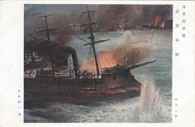 Naval Battle of Hakodate (May 1869), Boshin War commemorative postcard, c. 1930. Foreground: Kosetsu, a modern steam-powered ironclad ram with mounted gunnery, served as the Imperial Japanese Navy’s flagship of a small ad hoc fleet assembled for the operation to land troops at Washinoki Bay north of the rebel capital at Hakodate on peninsular Hokkaido. Although considered technically superior, the Tokugawa navy was routed by the Imperial fleet.