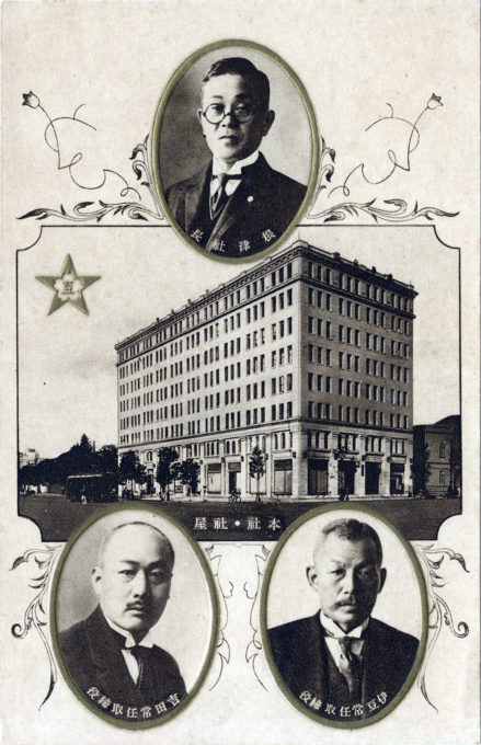 Top inset photo: Nezu Kaichiro, president of the Tobu Railway Co., c. 1920, above an illustration of the company headquarters in the Oshiage district, near the present-day location of Tokyo Skytree across from Asakusa. Nezu was industrialist, politician and philanthropist who, along with managing the Tobu Railway was also a director on the boards of Tokyo Electric Light Company (today’s TEPCO) and Tokyo Gas.
