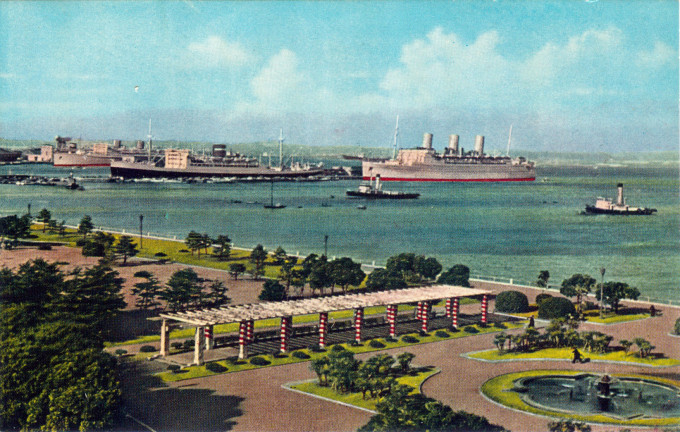 An elevated view of Yamashita Park, Yokohama, ca. 1960. The black-hulled ship moored at center is the Hikawa Maru, the only surviving NYK passenger liner (of 36, pre-war) of the Pacific War. In the foreground is one the post-war “Empress” ships of the Canadian Pacific Steamship Co.