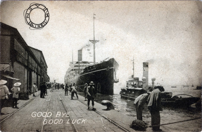NYK Line, Yokohama, c. 1920. Departure of the Hakozaki Maru. (Note: Photo was reversed before printing on postcard.)
