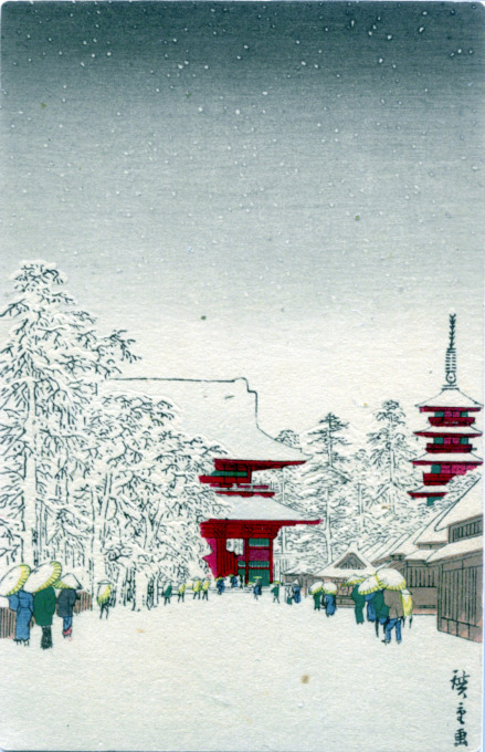 Postcard reproduction (partial) of Hiroshige Utagawa’s “Kinryūzan Temple in Asakusa”, Tokyo, in the snow. The original, first printed in 1856 as #99 of Hiroshige’s “One Hundred Famous Views of Edo”, was framed with a large chochin [paper lantern] in the upper-right quarter and the suggestion of an open gate along the left side, removed (presumably) to avoid them from dominating the same snow-laden landscape portrayed in the much-smaller reproduction published c. 1940 by S. Watanabe, Tokyo. It was said of the original woodblock print that it commemorated the restoration of the pagoda after damage suffered in the 1855 Ansei Edo earthquake and subsequent fires that destroyed 50,000 buildings, and killed upwards of 10,000 people, in the Tokugawa capital.