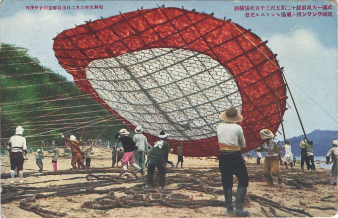 Round kite (wanwan-dako) flying at Naruto, Shikoku, 1935. The giant, round wanwan-dako of Shikoku’s Tokushima Prefecture are well-known as some of the largest kites made in the world. These commemorative postcards depicting the flights of these giant kites are dated June 2, 1935 (Showa 9).