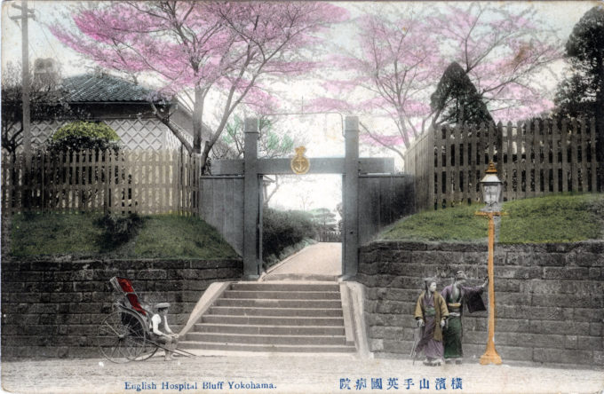 “The hospital is picturesquely situated in the extensive grounds overlooking the sea on the Bluff, the best part of the foreign residential quarter of Yokohama. It is completely equipped with every accommodation for 200 or more patients, and is the sanitorium for the sick and convalescents for all of His Majesty’s ships on the China Station.”
