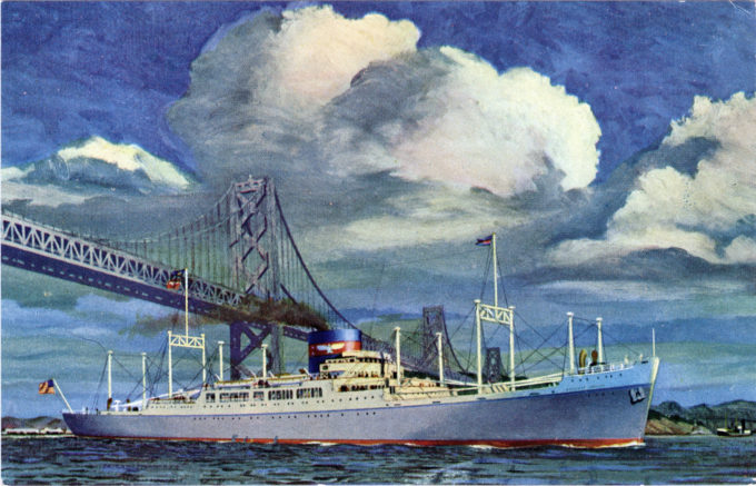 S.S. President Monroe, American President Line, c. 1960, passing under the San Francisco-Oakland Bay Bridge. The President Monroe was one of seven passenger-cargo transports built for American President Lines (APL) for use by the US Navy as attack-transports in the event of war. Launched in 1940 and completed in 1941, the then-AP-104 had just cleared Golden Gate Bridge on its maiden voyage around-the-world when word was received that Pearl Harbor had been attacked. AP-104 participated in the invasions of the Gilbert Island, the Marshall Islands, and Guam. The transport was returned to civilian service in 1947.