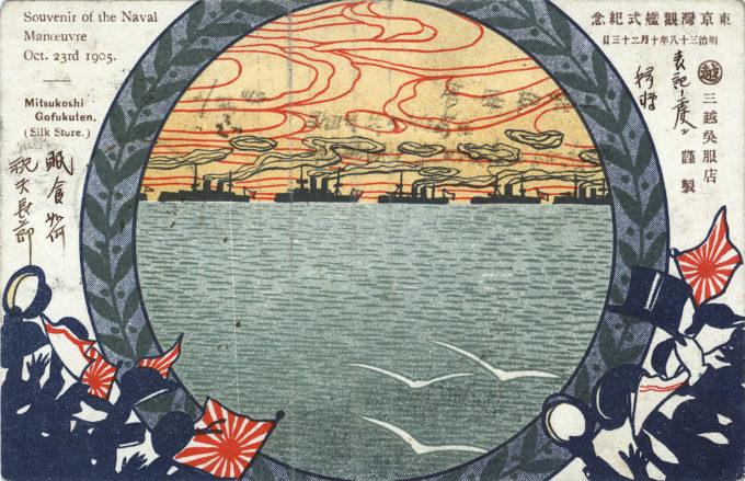 “Souvenir of the Naval Manoevre, Oct. 23rd 1905”, Mitsukoshi Department Store advertising postcard, 1905. One of several published by Mitsukoshi to commemorate the Grand Fleet Review by Emperor Meiji of the triumphant Imperial Japanese Navy following the end of the Russo-Japanese War.