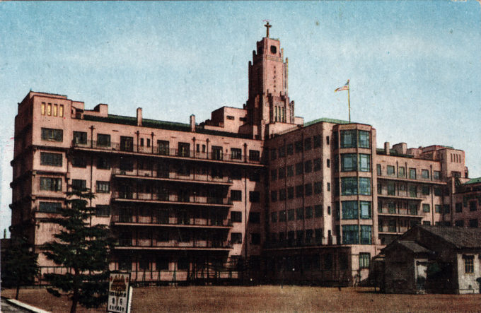 Postcard back-caption: “St. Luke’s International Medical Center, Tokyo, in 1946, presently used by 49th General Hospital U.S. Army, was founded by the Episcopal Church [in 1902], and is recognized as the foremost Medical Missionaries Enterprise in the Far East.”