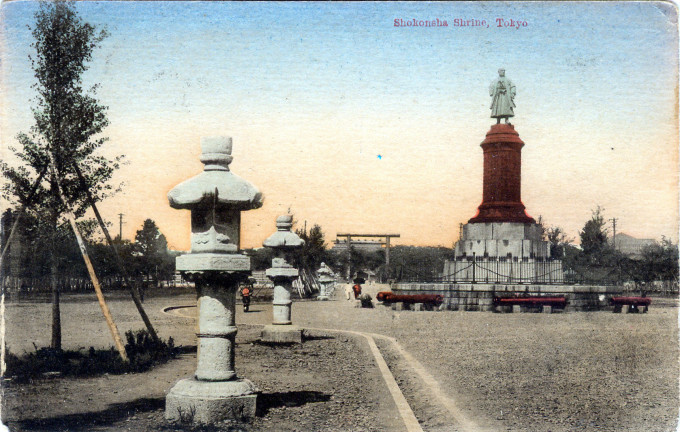 “… I remember the time the statue of Omura was erected, and the time when a fence was put around it. I remember the pair of stone lions being put there, after being seized at Hai-ch’eng in the war with China [1894-1895]. I remember Yoshida Banka’s large stone column being put up, inscribed with the name ‘Yasukuni Shrine’.