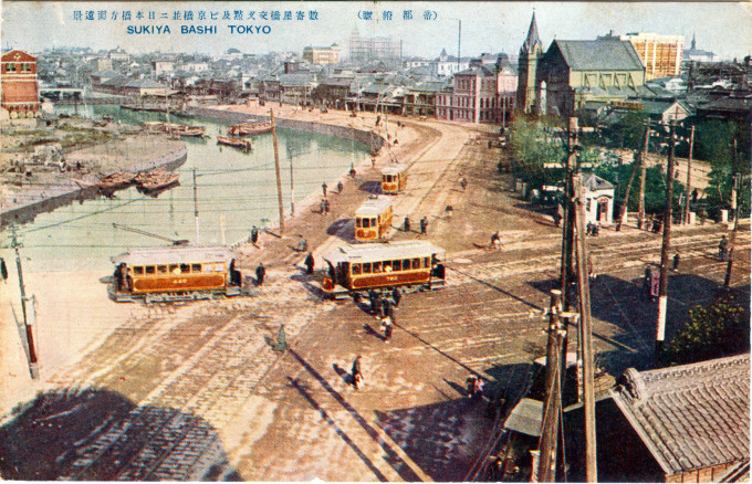 Streetcars crossing the canal at Sukiyabashi, Tokyo, c. 1910, with the newly-consecrated Ginza Methodist Church at upper-right. In the far distance can be seen the towering Dai-Ichi Sogo building at Kyobashi.