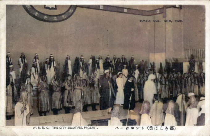 “W.S.S.C. The city beautiful pageant [sic]”, Tokyo, 1920 (colorized), inside the Imperial Theatre which substituted for the destroyed Convention Building. The original pageant costumes were destroyed in the fire but were recreated almost overnight by the participants. (Gift of J. Harper Brady Sr.)