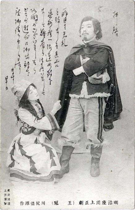 In early 1893, at the suggestion of another mutual friend, Baron Kaneko Kentaro (Ito’s personal secretary and future Minister of Agriculture and Commerce), Kawakami embarked on a personal five-month trip to Paris to study European theater. Upon his return to Japan, he infused several new innovations into Japanese traditional theater, from lighting nothing but the stage using only electric lights, to applying only faint coatings of makeup, and delivering dialogue naturally without a stilted delivery, the use of contemporary patriotic events as subject matter, and the frequent adaptation of western classics (e.g. Shakespeare). All were considered radical moves for the time. Kawakami is thus considered to be one of the founders of shinpa, Japan’s “new school” theater, that was considered to be more contemporary and realistic in its performance than the more traditional kabuki and noh.