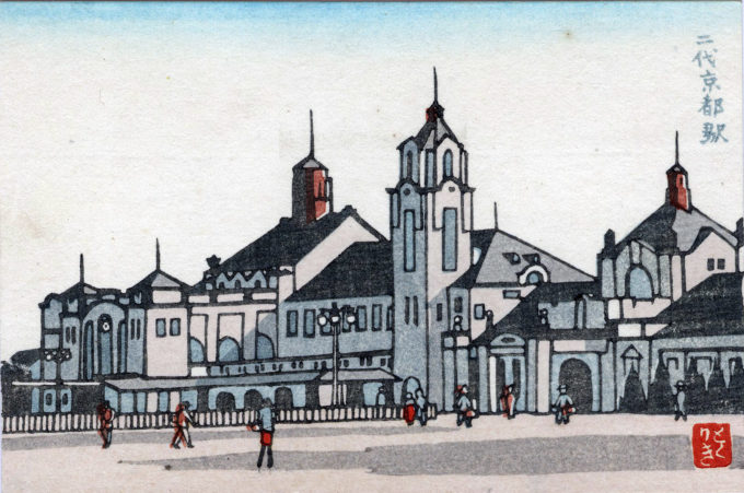 Second Kyoto Railroad Terminal, c. 1950, a shin-hanga reproduction attributed to Tokuriki Tomikichiro. The reverse of this postcard is captioned “Kyoto Station, completion of construction [in 1914].” This terminal burned to ground in 1950, and was replaced by an unattractive two-story ferro-concrete building typical of the blockish, gray architecture of post-war Japanese construction.