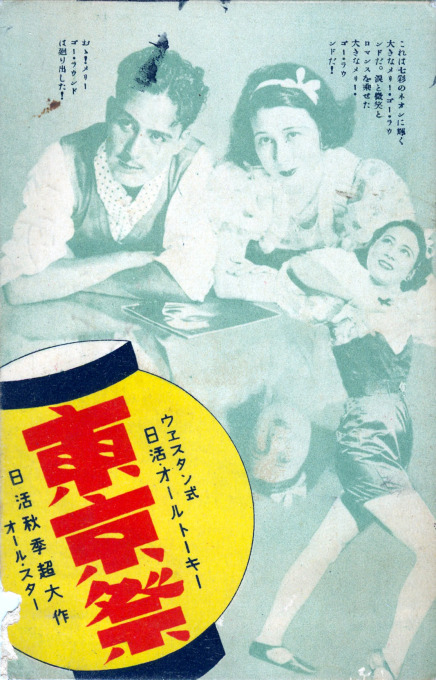 Advertising postcard for Nikkatsu Studio’s “all-talkie” motion picture, Tokyo Festival [Tokyo-matsuri, 東京祭], released on September 29, 1933, directed by Ushihara Kiyohiko who had studied filmmaking in Hollywood under the tutelage of Charlie Chapin. Tokyo Festival featured the popular actress Natsukawa Shizue – star of Nikkatsu Studio’s wildly successful 1929 silent feature Tokyo March – and state-of-the-art Western Electric sound-on-film recording and reproduction technology.