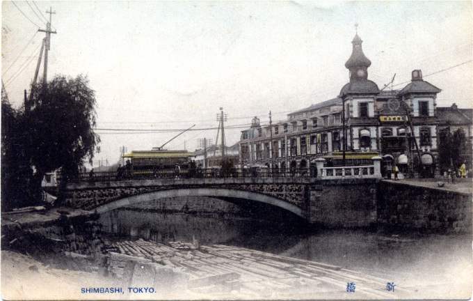 Electric streetcar glides across Shimbashi, c. 1905. Route #1, from Shinagawa-to-Ueno via Shimbashi & Ginza, was the first streetcar route to be completely electrified.