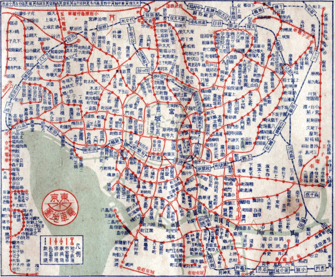 Map: Streetcar (in red), subway (Ueno Station-Asakusa, hashed-red line), and commuter trains (in blue); Tokyo, c. 1930. (For reference, the Imperial Palace is at center.)