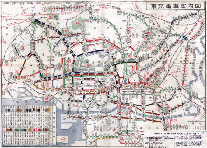 Map: Streetcar, Tokyo, c. 1940. (For reference, the Imperial Palace is at center.) At its peak in the 1930s, the Toden system boasted 41 routes with 213 kilometers of track. In the aftermath of the 1923 Great Kanto Earthquake, city planners had already begun to place more emphasis on vehicular bus service (principally because of the expensive repairs to track and tram wires needed after the earthquake). And, in the postwar era, the increase in automobile traffic resulted in steep reductions in ridership. From 1967 to 1972, 181 km of track were abandoned.