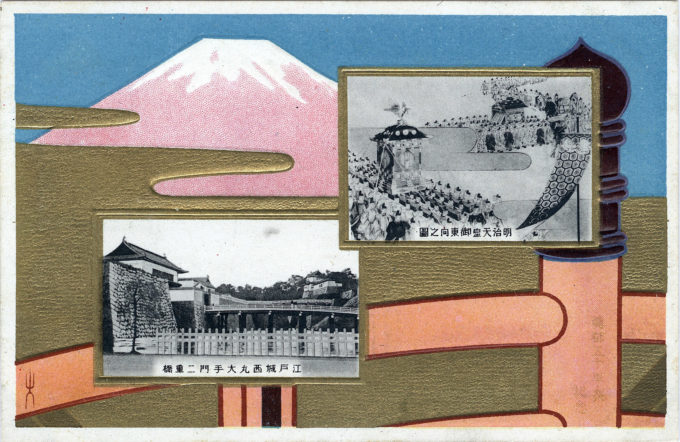Top-right inset: Emperor Meiji’s procession to the former Edo Castle. Bottom-left inset: Ote-mon (gate) and Nijubashi Bridge at the Imperial Palace. From a postcard series commemorating the 50th Anniversary transfer in 1869 of the nation’s capital from Kyoto to Tokyo, 1919.